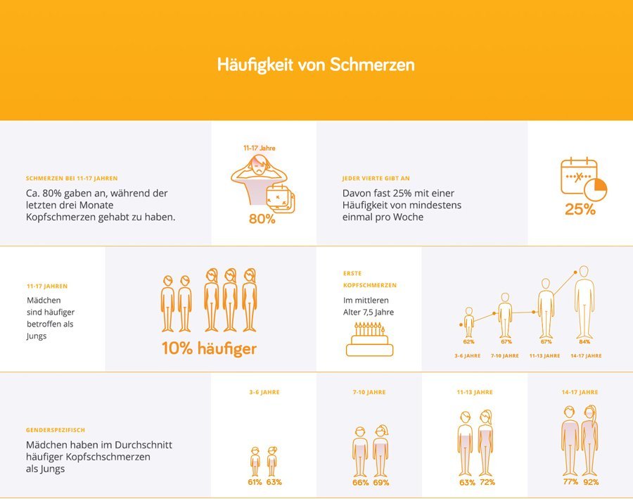 Unter Kopfschmerzen leiden weitaus mehr Kinder, als man vermuten würde. Bereits jedes fünfte Vorschulkind kennt Kopfschmerzen, von den Kindern im Grundschulalter sind es mehr als die Hälfte. In einer Studie gaben 80 % der befragten Jugendlichen im Alter von 11-17 Jahren an, in den letzten drei Monaten Kopfschmerzen gehabt zu haben.