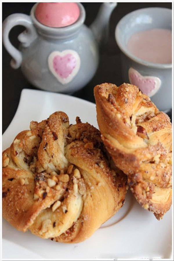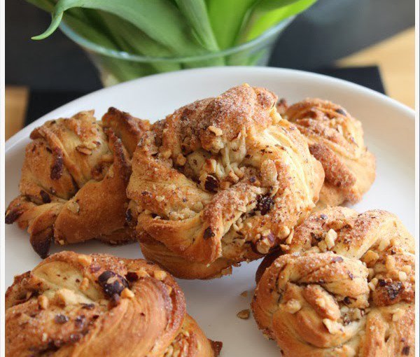 - Jeden Streifen erst zur Kordel drehen und anschließend zu einem Knoten wickeln. Auf ein mit Backpapier ausgelegtes Backblech legen. Rest Butter auf die Knoten streichen, mit übrigen Nüssen und Zimtzucker bestreuen. Zugedeckt ca. 10 Minuten gehen lassen. Im heißen Ofen 12 – 14 Minuten backen. Herausnehmen, auskühlen lassen